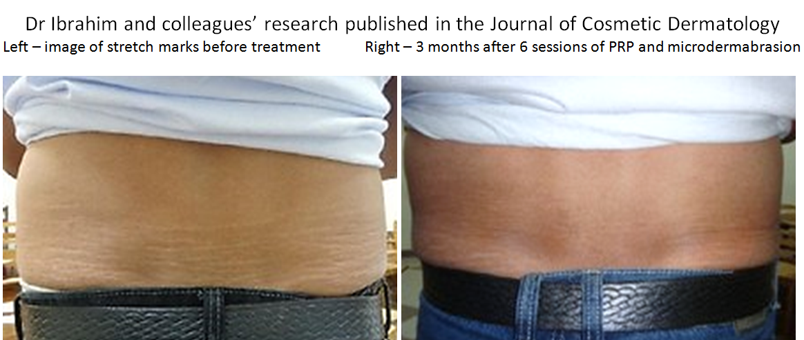A study led by Dr Ibrahim and colleagues has assessed the safety and efficacy of platelet-rich plasma (PRP) vs. microdermabrasion for striae distensae (stretch marks) on 68 patients. Published in the Journal of Cosmetic Dermatology the researchers found there was significant clinical improvement of striae distensae in patients treated with PRP injection and patients treated with combination of PRP and microdermabrasion when compared with patients treated with microdermabrasion. However, combination of PRP and microdermabrasion in the same session showed better results in short duration.